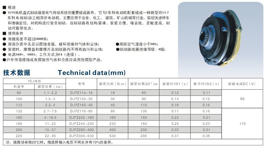 DJPZ点击盘式制动器是电气传动系列的重要组成器件,他与Y系列电动机配套组成一种新型的YEJ系列电磁制动三相异步电动机,主要应用于冶金、化工、建筑、矿山机械等行业,实现快速停车和准确定位,对机构进行安全制动。该制动器有结构紧凑,安装方便,噪音低,灵敏度高,制动可靠等特点。